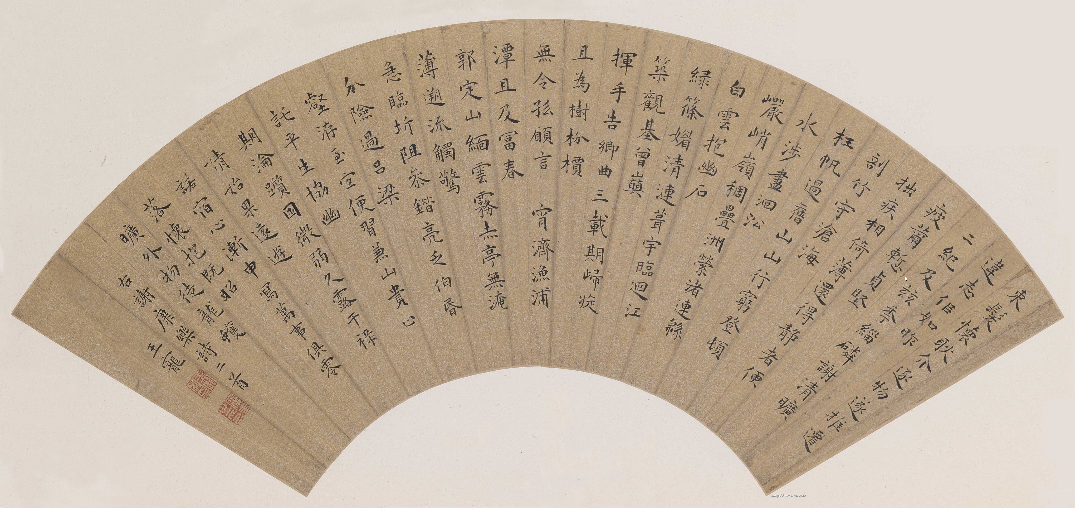 | 【參考】 王寵《小楷謝康樂詩》扇面 金箋,楷書,縱17.7cm,橫54.3cm。 北京故宮博物院藏 | |