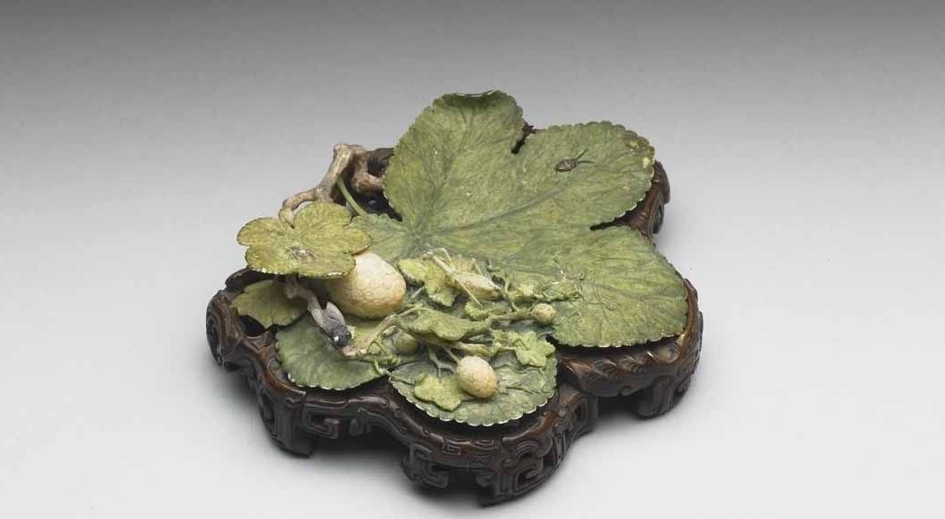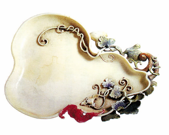 象牙雕葫蘆形筆掭,清,高1.6cm,最長17.8cm,最寬13cm。清宮舊藏。筆掭為淺緣盤,葫蘆式。盤上浮雕并鏤雕葫蘆枝蔓、葉片及小葫蘆為飾,并蜿蜒于盤側(cè)及底部,又伸入盤內(nèi),增添了器型的變化。盤仿葫蘆形的束腰處則浮雕一蝙蝠。 |