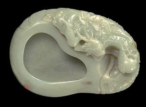 這件筆掭青白玉料,表面有光澤,局部有黃沁。器似剖開之葫蘆,一側(cè)浮雕一龍,雙眼圓睜緊隨火珠于云海之上。龍頭與珠之間飾圓池,可盛水,另一邊琢池呈淺洗。龍紋生動,琢磨精細(xì),可作精美的陳設(shè)品。