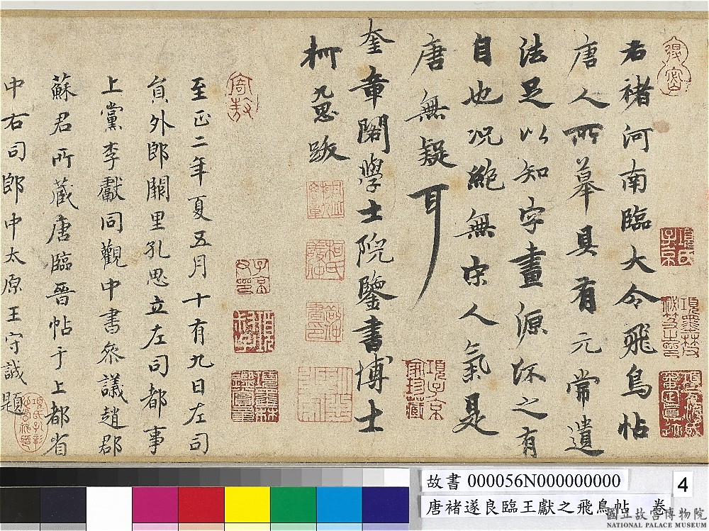 柯九思跋:右褚河南臨大令飛鳥帖。唐人所摹。具有元常遺法。足以知字畫源流之有自也。況絕無宋人氣。是唐無疑耳。奎章閣學(xué)士院鑒書博士柯九思跋。