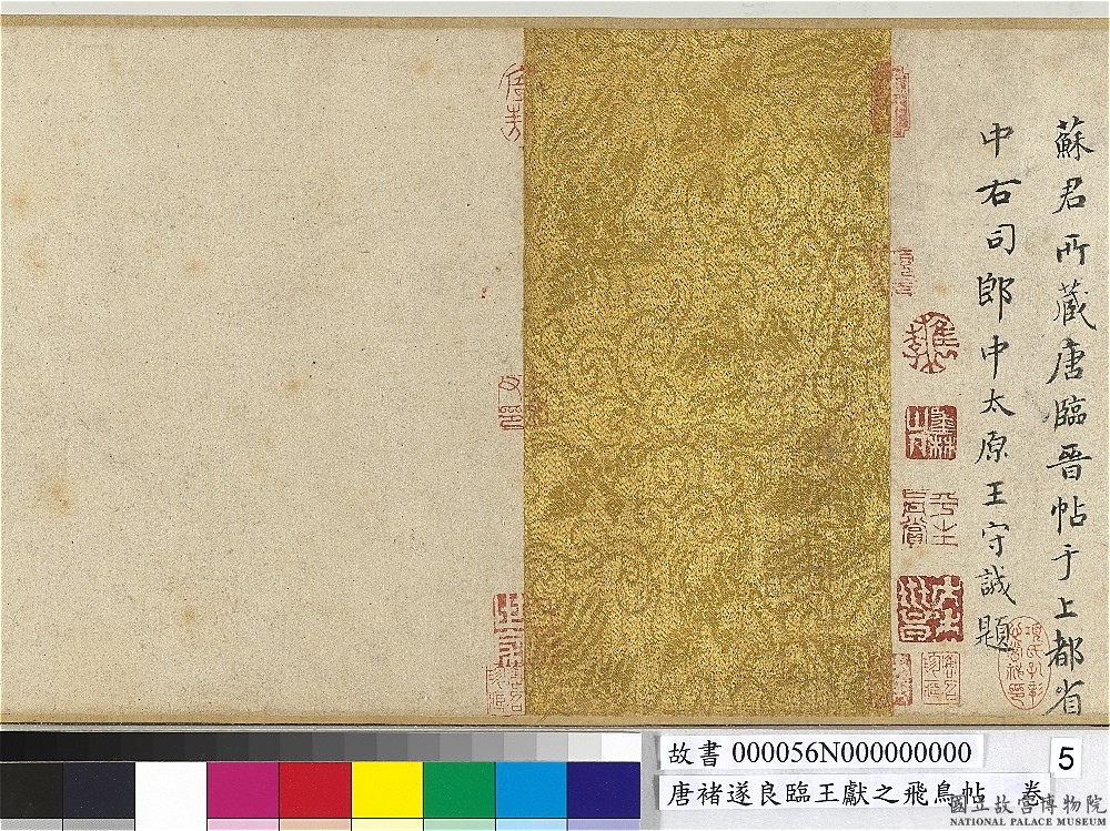 褚遂良臨王獻(xiàn)之《飛鳥帖》正書二十一行,麻紙本,縱二二公分,橫四七.四公分。后有元柯九思、王守誠二跋,《石渠寶笈初編》有著錄,原跡今藏臺(tái)北故宮博物院。卷內(nèi)鈐有“紹興”(宋內(nèi)府)、“子固”(趙子固)、“歐陽玄”、“應(yīng)召”(張應(yīng)召),又項(xiàng)墨林及諸內(nèi)府等收傳印記。帖后有項(xiàng)墨林手書小字一行曰“唐褚遂良臨晉王大令獻(xiàn)之《飛鳥帖》項(xiàng)元汴真賞,其值……(下模糊不清)”。元人柯九思跋稱其:“具有元常遺意,絕無宋人氣,是唐無疑耳”。然獻(xiàn)之之文既屬荒誕,褚遂良臨亦非真筆,唯運(yùn)筆精斂,氣韻高古。則此卷雖非褚氏真筆,亦不失為唐人妙跡。