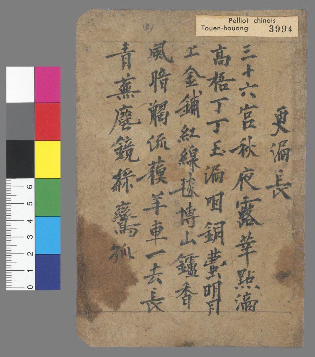 上面選錄的是伯3994卷作品,最為經(jīng)典。冊頁裝,為專門的曲子詞寫卷。此卷合計完詞五首,其中《更漏子》(三十六宮秋夜)、《菩薩蠻》(紅爐暖閣佳人睡)二詞,為五代詞人歐陽炯作品,見《尊前集》;《更漏子》(金鴨香紅蠟淚)為晚唐詞人溫庭筠作品,見《花間集》。溫庭筠為并州太原人,歐陽炯為益州華陽人,他們均為花間詞人,其活動與西北無涉。此次其他詞作,主題皆關(guān)春愁秋怨,閨閣閑情,文風(fēng)亦極類《花間集》,毫無邊塞作品痕跡。其寫卷無疑是傳自中原的。