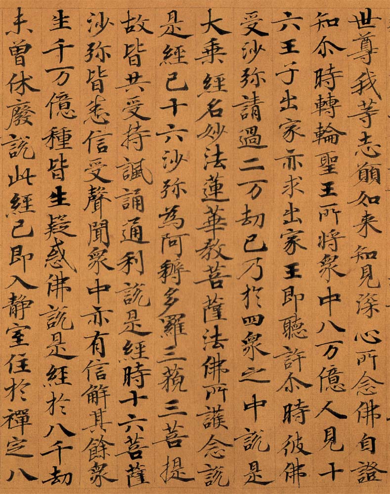 經(jīng)卷之寫經(jīng)部分飾淡墨烏絲欄,欄高二○一毫米,欄距一六毫米至二○毫米不等,每欄書寫一行經(jīng)文。卷首和卷尾均無寫經(jīng)者名款和書寫年月。經(jīng)文為行楷體,點畫精麗,筆筆飛動,體態(tài)秀逸,神采艷發(fā),通篇貫氣,多勁健明快之韻。