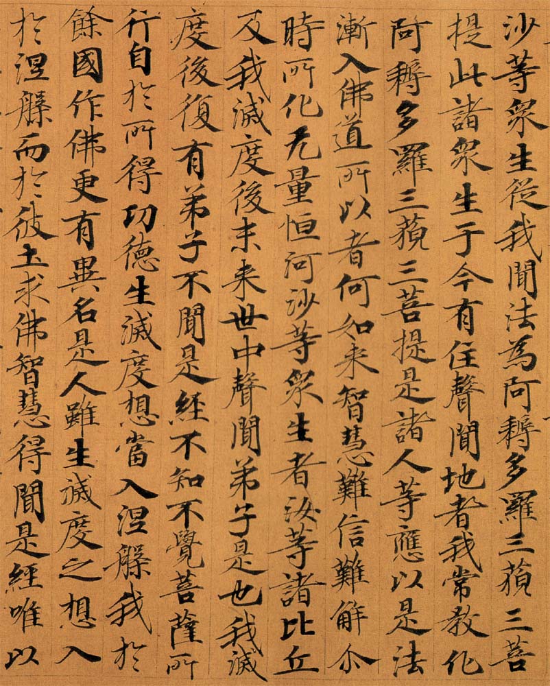 此經(jīng)卷,為藏經(jīng)洞散出前之古裝裱,直接用二○幅單層寫經(jīng)紙拼接成,卷首〔米帖〕內(nèi)包有似蘆葦桿樣的植物莖桿,〔拖尾〕卷軸內(nèi)包有黃揚木質(zhì)之卷軸軒。每紙長度不一,長者大多為四五八毫米,短者僅八二毫米。整卷長七七三九毫米,其中引首部分長二○四毫米,寫經(jīng)部分長七四五三毫米,拖尾長八二毫米。寫經(jīng)部分之紙,厚而軟,纖維細長,質(zhì)堅實而有韌性,表面細膩、勻整、平滑,透光照看無簾紋,墨跡不透及紙背,色赭黃,當(dāng)年染過黃蘗汁。經(jīng)文字跡,墨色烏黑如漆。