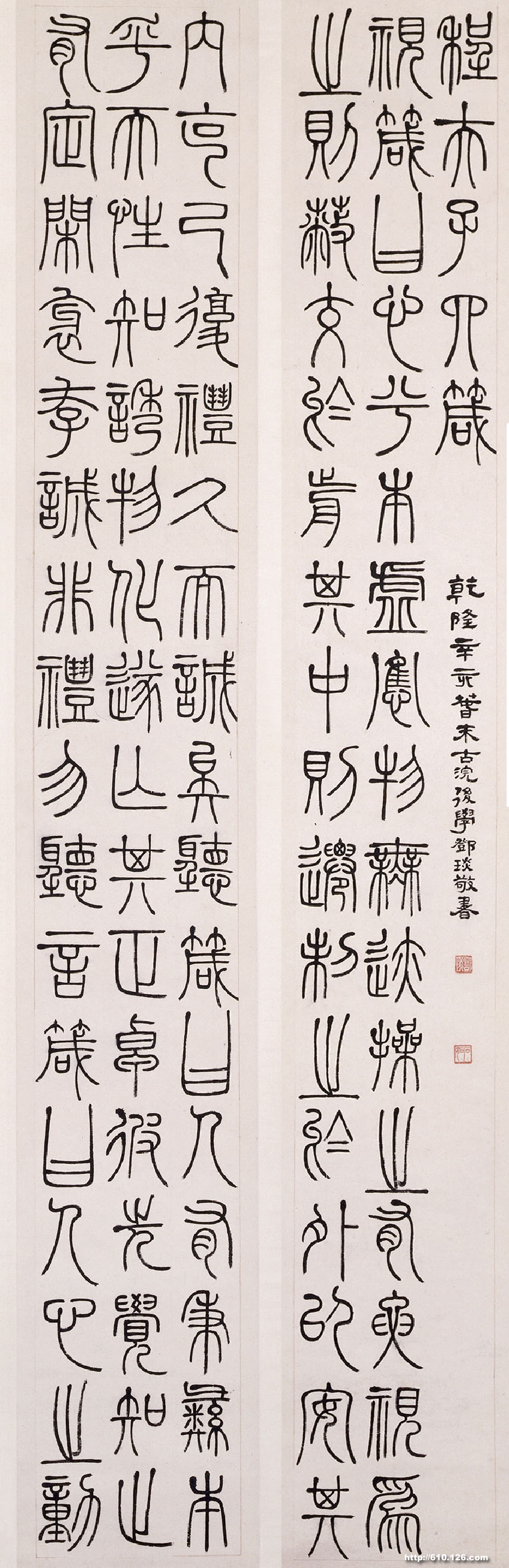 此屏為鄧石如中年時(shí)期篆書精作,結(jié)構(gòu)謹(jǐn)嚴(yán),筆法灑脫自如,突破傳統(tǒng)“玉筯篆”的風(fēng)格,融入金石銘文的書法特點(diǎn),復(fù)摻入隸書筆法,獨(dú)具婉麗圓勁的魅力。