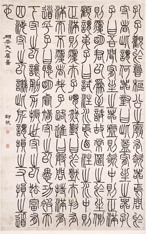 此軸篆書錄文一則(《篆書文》軸釋文),末隸書識:“頤齋大人屬書。鄧琰。”下鈐“鄧琰”、“石如”印二方。具體書寫時(shí)間不詳,但從題款名字看,應(yīng)是鄧石如在嘉慶以前的作品。本幅無藏印,未見著錄。此軸書法用筆細(xì)勻,受《嶧山碑》及李陽冰篆法影響,使用羊毫中鋒,筆劃圓勁,收筆處略出鋒,呈尖峭狀,尚屬傳統(tǒng)玉筯篆之范疇。