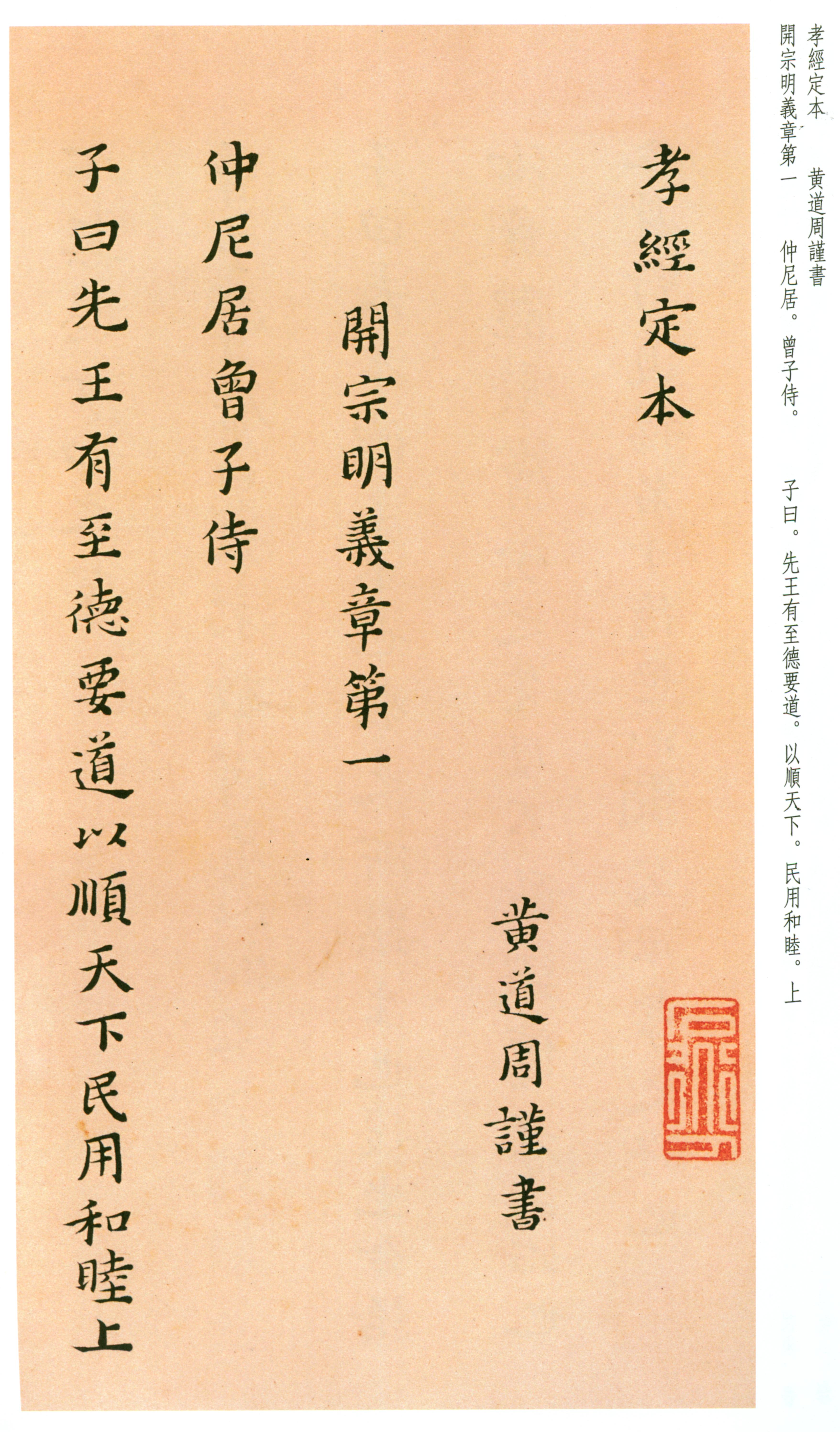 《孝經(jīng)大傳序》中言:“臣觀《孝經(jīng)》者,道德之淵源,治化之綱領(lǐng)也,六經(jīng)之本皆出《孝經(jīng)》。”黃道周認(rèn)為、孝乃