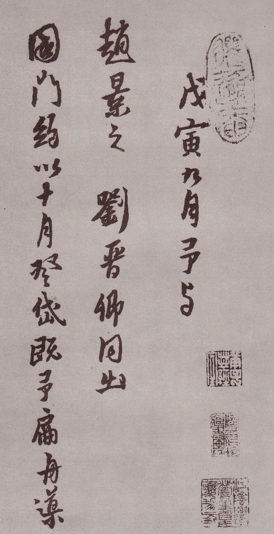 釋文:戊寅九月,予與趙景之、劉晉卿同出國門,約以十月登岱,既予扁舟導河甚迅,夜過德安,遂倍道先馳。至岱五、六日,遲二公不至,遂先渡江,時奴已入口輦下戒嚴,二公踵發(fā)泰安,不復留連。先後余商邈焉。隔歲,彼此鱗羽亦復縑稀,至己卯歲除,浦城丁明鴈始緘得景之登岱詩,汪洋舂容終夜讀之,不復能寐。是夕守歲,因作寄景之詩四章,並為登岱歌,空山哀吟,幸無鄰人動其驚歎。得小卷書之,萬里經年,異情異事,唯吾三人,興言永矢,未能忘也。