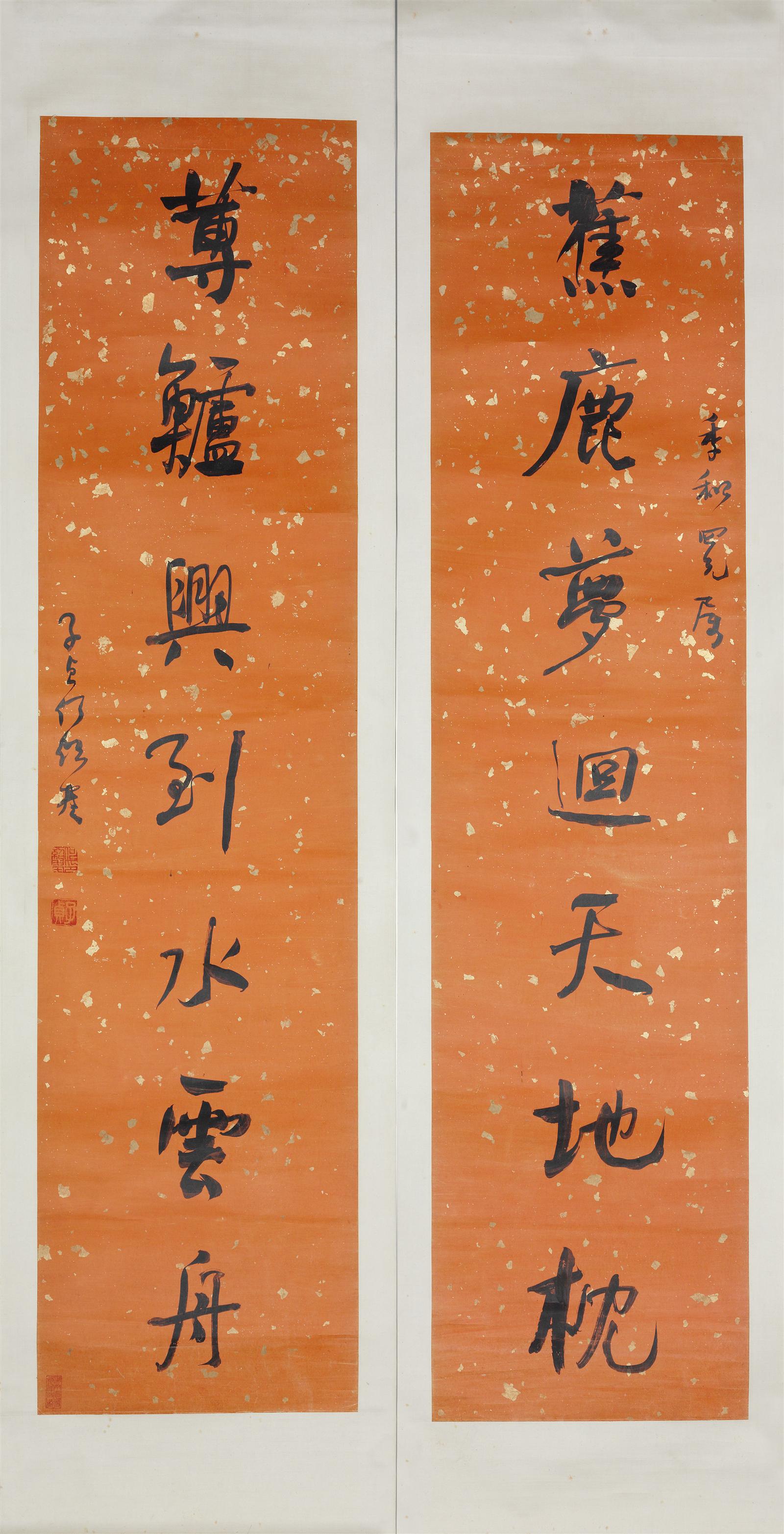 這幅對聯(lián)寫的是“蕉鹿夢回天地枕,莼鱸興到水云舟”,取自元朝詩人仇遠的作品。“蕉鹿”是《列子》里的一個故事,用來形容夢幻之境。“莼鱸”出自《世說新語》,是思念故鄉(xiāng)的意思。