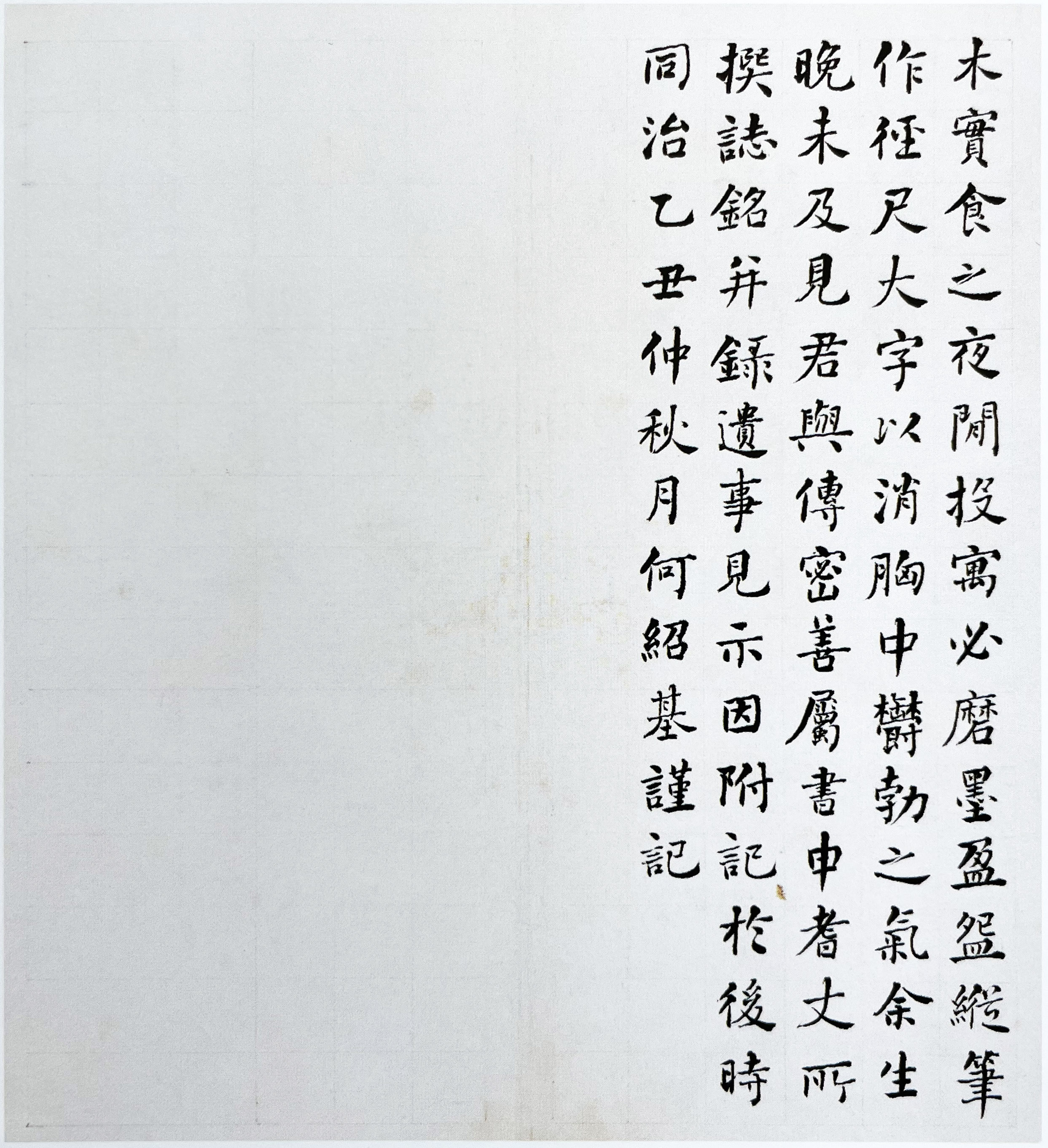 釋文: 木實(shí)之,夜間投寓必磨墨盈盌,蹤筆作徑尺大字,以消胸中郁勃之氣。余生晚,未及見(jiàn)君,與傳密善,屬書(shū)申耆丈所撰志銘,并錄遺事見(jiàn)示,因附記于后。時(shí)同治乙丑仲秋月,何紹基謹(jǐn)記。