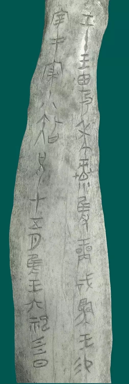 這是刻于商王帝乙或帝辛六年的一塊記事肋骨。一面刻有文字,記載帝辛將獵獲的犀牛賞賜宰豐之事,另一面刻獸面、蟬紋和虺龍紋,并嵌有綠松石。殷墟遺址中出土15萬片以上甲骨,是中國目前最早的文獻檔案材料,它的內(nèi)容涉及商代社會各個領(lǐng)域,有關(guān)于社會和國家結(jié)構(gòu)的,如奴隸和平民、奴隸主和貴族、官吏、軍隊、刑罰、監(jiān)獄、戰(zhàn)爭、方域貢納;有關(guān)于經(jīng)濟生產(chǎn)的,如農(nóng)業(yè)、畜牧、漁獵、手工業(yè)、商業(yè)、交通;有關(guān)于科學(xué)文化和思想意識的,如天文歷法、氣象、建筑、疾病、生育、鬼神崇拜、祭祀、吉兇夢幻、卜法、文字等。