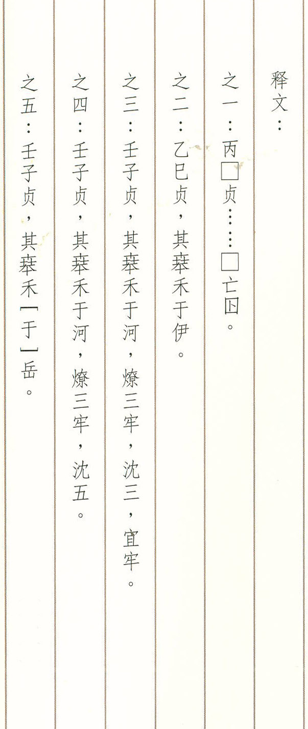 這件卜骨舊錄于郭若愚所編《殷契拾掇二編》,相傳出土于河南安陽(yáng)。除第一辭卜問(wèn)兇咎外,其余各辭分別向伊丶河、 岳祈佑稼禾的豐收,并間以燎祭、沉祭或宜祭及用牲的數(shù)量。伊,即伊尹,是商先王成湯時(shí)期的要臣。