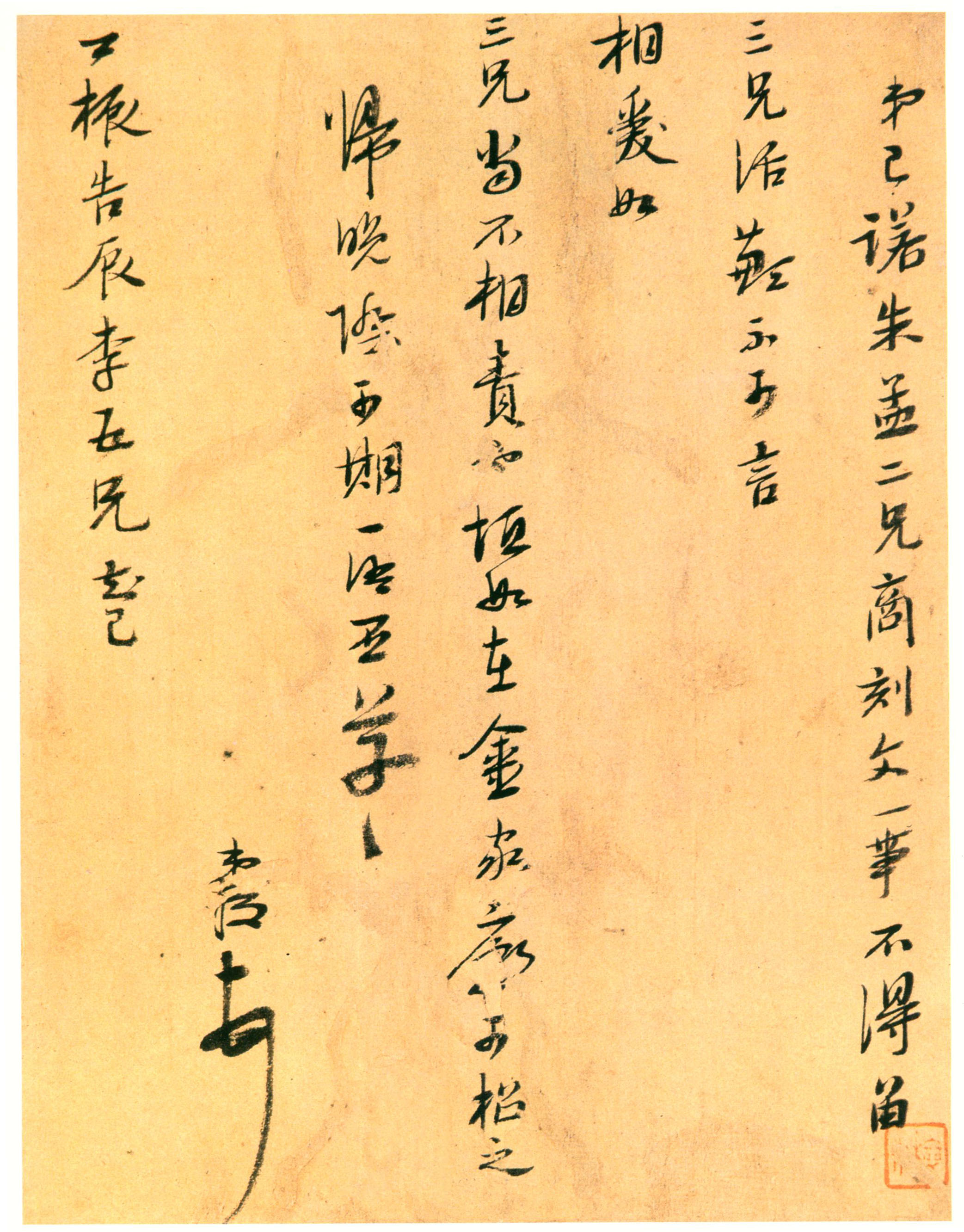 陳洪綬《致三兄短札》紙本 21.3×16.5cm 約崇禎三年(約1630)南京博物院藏 釋文:弟已諾朱孟二兄商刻文一事不得留三兄話歉不可言。相爰如三兄當(dāng)不相責(zé)也頃如在金家廟不可招之。歸晚際可期一語否草草。弟綬頓首。卿振告辰李五兄知己。 【資料來源】《陳洪綬書畫集》 (中國民族攝影藝術(shù)出版社)