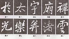 7.多豎并列寫法。一字之中如有多豎并列出現(xiàn)時(shí),如不注意調(diào)節(jié),最易刻板。因此要注意每豎均要有不同的寫法,且豎與豎之間的關(guān)系也要注意變化,如呈相向還是相背之態(tài),等等。如圖七“佛”字。