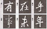 6.并列橫。一字中數(shù)橫并列,在書寫時(shí)要注意它們的長短、粗細(xì)、正斜等各種變化,不能寫得一樣,否則就會變成美術(shù)字而毫無生氣。如圖六“年”字的橫畫。