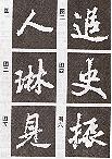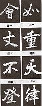1.方折。這是魏碑寫法,即輕入重按上抵,再右下重頓,調(diào)鋒回中,作弧下行。作此畫須留意右下重頓后下行的弧畫要重、渾,否則會使全字失衡。如圖八“回”字。