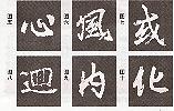 6.背拋鉤,如圖六“風(fēng)”字。其具體書寫方法是:先作斜橫,要有一定的弧度,轉(zhuǎn)折處作提按,然后向內(nèi)凹直下,再作外彎,最后出鉤上挑。此種鉤弧度大,用筆宜靈活。