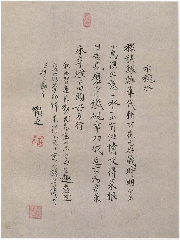 釋文:稼穡艱難筆代耕,百花已共歲時明。小蟲小鳥俱生意,一水一山有性情。咬得菜根甘苦見,磨穿鐵硯事功成。卮言為寄東床李, 燈下田頭好力行。