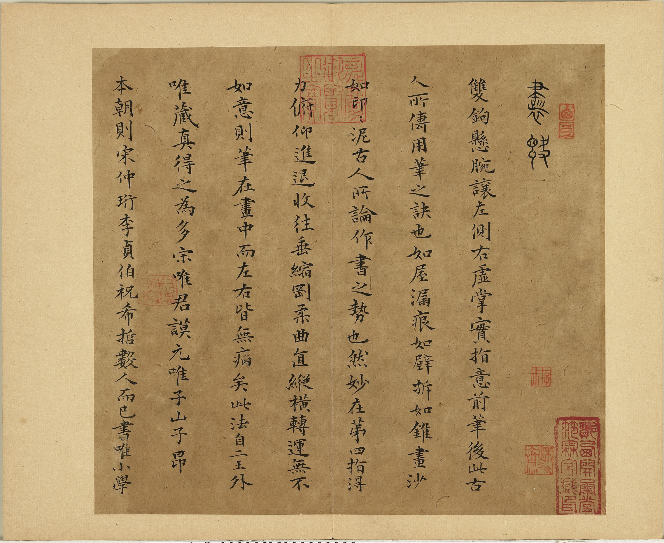 釋文:書訣。(篆書)。雙鉤懸腕。讓左側(cè)右。虛掌實指。意前筆后。此古人所傳用筆之訣也。如屋漏痕。如壁拆。如錐畫沙。如印印泥。古人所論作書之勢也。然妙在第四指得力。俯仰進退。收往垂縮。剛?cè)崆薄?v橫轉(zhuǎn)運。無不如意。則筆在畫中。而左右皆無病矣。此法自二王外。唯藏真得之為多。宋唯君謨。元唯子山子昂。本朝則宋仲珩李貞伯祝希哲數(shù)人而已。書唯(唯疑雖誤)小學。