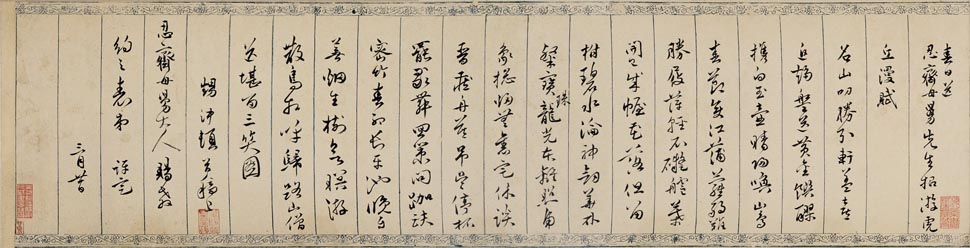 釋文:春日送忍齋母舅先生招游虎丘,漫賦。名山叨勝分,軒盡喜返趨。盤(pán)送黃金饌,醪攜白玉壺。晴陽(yáng)喚山鳥(niǎo),春節(jié)變江蒲。蘿弱難勝屐,萍輕不礙艫。葉開(kāi)已成幄,花落但留拊。碧水淪神劍,華林粲寶珠。龍光本離照,虎象總歸無(wú)。舊宅休談晉,藏舟莫吊吳。停杯罷歌舞,回策問(wèn)跏趺。密竹春初長(zhǎng),平地晚自蕪。煙生樹(shù)欲暝,游散鳥(niǎo)相呼。歸路山僧送,堪留三笑圖。甥沖頓首,稿上忍齋母舅大人賜教、約之表弟評(píng)定,三月廿一日。