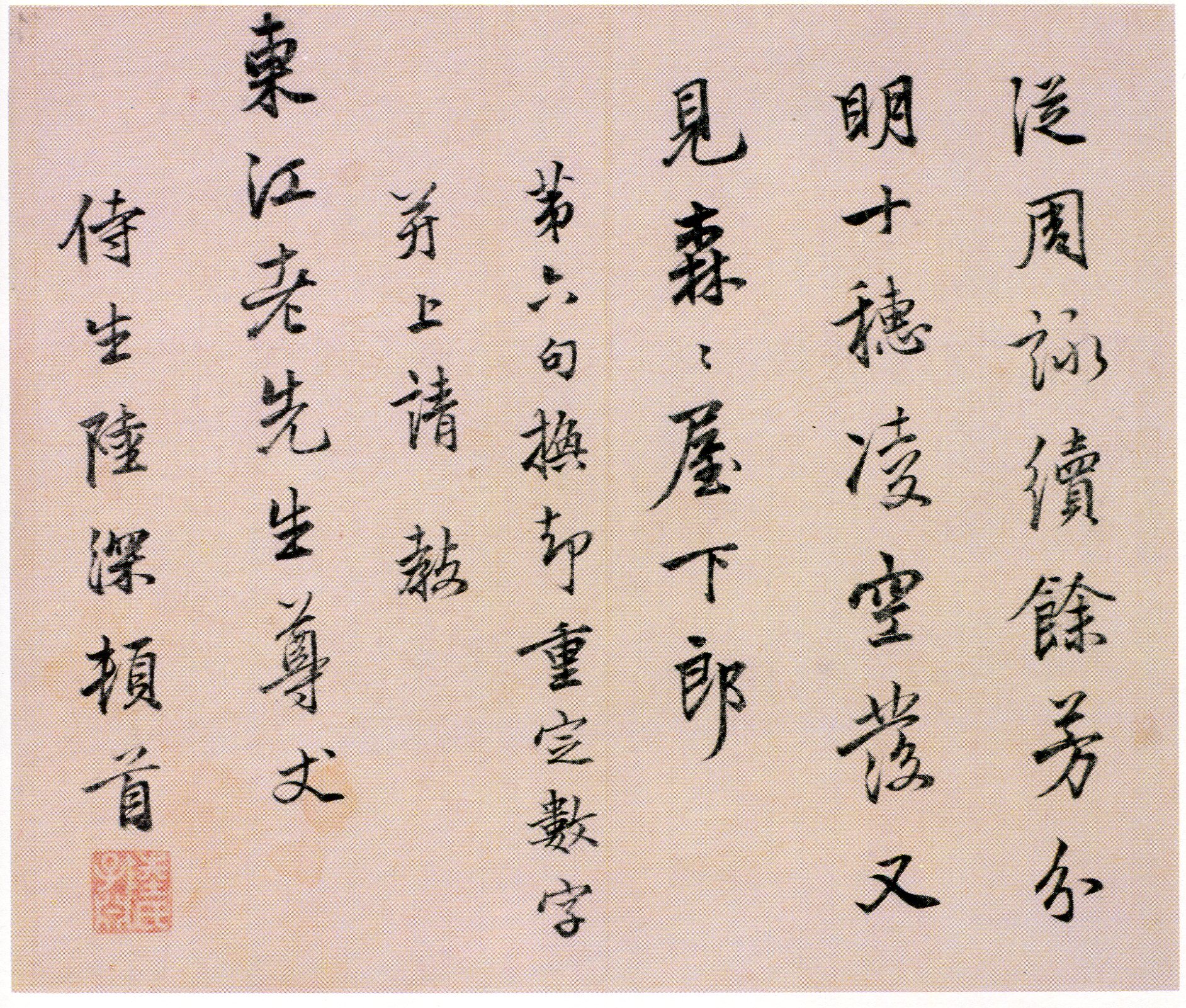 第六句換卻重定數(shù)字,并上請(qǐng)教?hào)|江老先生尊丈。侍生陸深頓首。