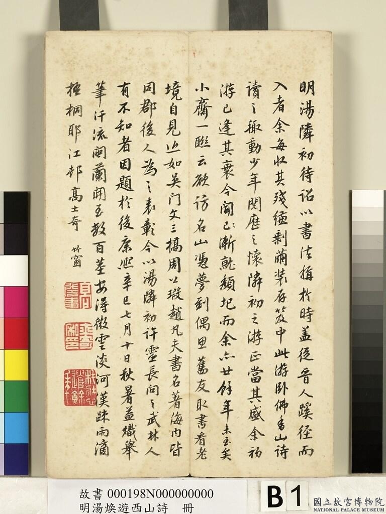 題跋:明湯隣初待詔。以書法稱於時。蓋從晉人蹊徑而入者。余每收其殘縑剩繭。裝存笈中。此游臥佛香山詩。讀之輙動少年閱歷之懷。隣初之遊。正當(dāng)其盛。余初游已逢其衰。今聞已(點去)漸就頹圮。而余亦廿餘年未至矣。小齋一聯(lián)云。欲訪名山憑夢到。偶思舊友取書看。老境自見。近如吳門文三橋。周公瑕。趙凡夫。書名著海內(nèi)。皆同郡後人為之表彰。今以湯隣初許靈長問之武林人。有不知者。因題於後。康熙辛巳(西元一七0一年)七月十日。秋暑益熾。舉筆汗流。閩蘭開至數(shù)百莖。安得微雲(yún)淡河漢。踈雨滴梧桐耶。江邨高士奇。竹窗。