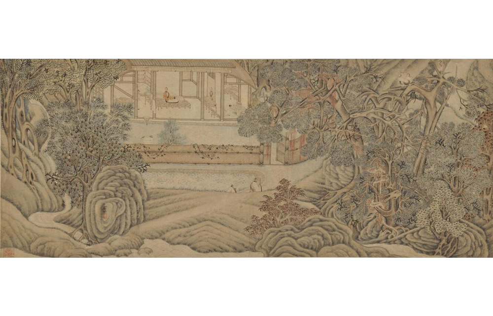 浙江省博物館藏有近代畫家黃賓虹捐獻(xiàn)的明代吳彬《蓮社求友圖卷》(又《林泉放鶴圖》 ),拖尾有同時(shí)代著名戲劇家湯顯祖長(zhǎng)跋《續(xù)棲賢蓮社求友文》。畫心縱28.3厘米,長(zhǎng)68.9厘米;題跋縱29厘米,橫239厘米。該卷繪畫與書法幾乎各占一半。全文如下:
