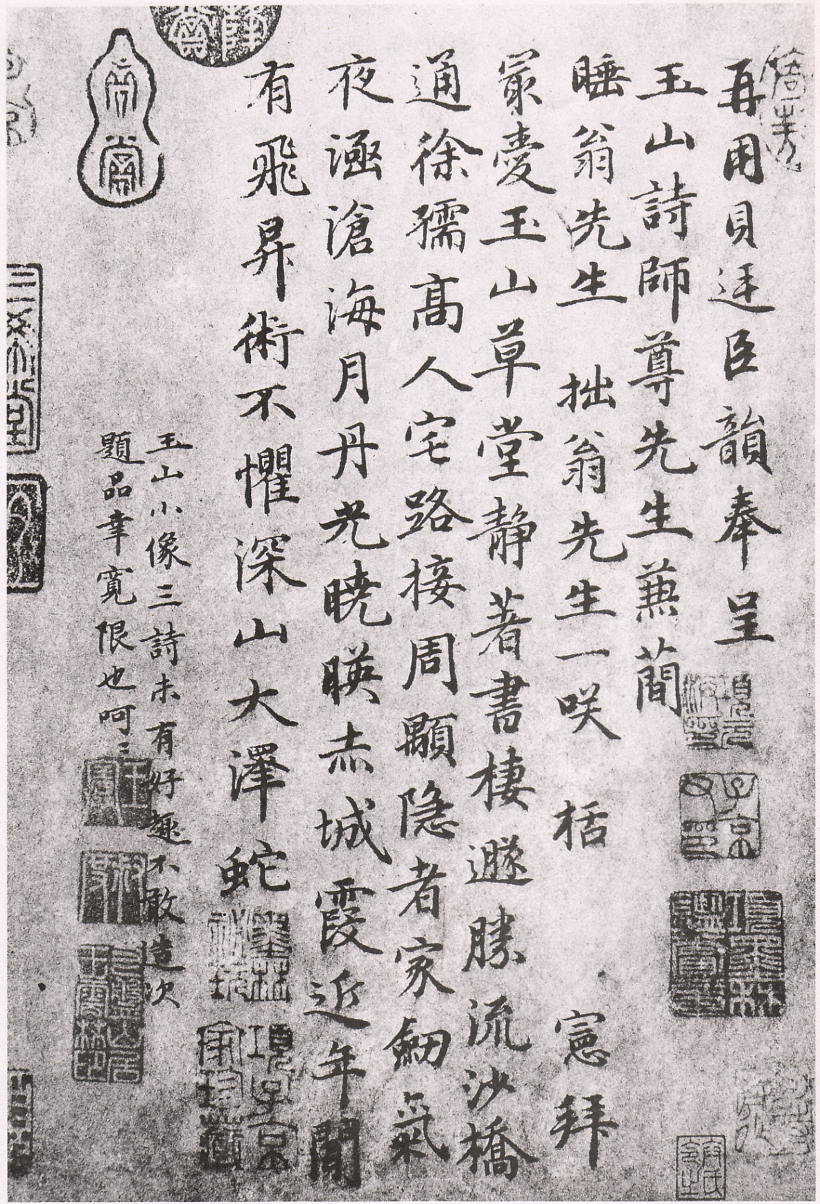 【釋文】: 再用貝廷臣韻。奉呈玉山詩(shī)師尊先生。兼簡(jiǎn)睡翁先生、拙翁先生一笑。栝 憲拜。最愛(ài)玉山草堂靜,著書(shū)棲遁勝流沙。橋通徐孺高人宅,路接周頤隱者家。劍氣夜涵滄海月,丹光曉映赤城霞。近年聞?dòng)酗w升術(shù),不懼深山大澤蛇。玉山小像三詩(shī)。未有好趣。不敢造次題品。幸寬限也。呵呵。