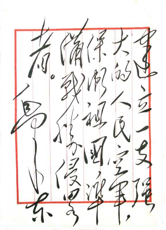 釋文:建立一支強(qiáng)大的人民空軍,保衛(wèi)祖國,準(zhǔn)備戰(zhàn)勝侵略者!毛澤東