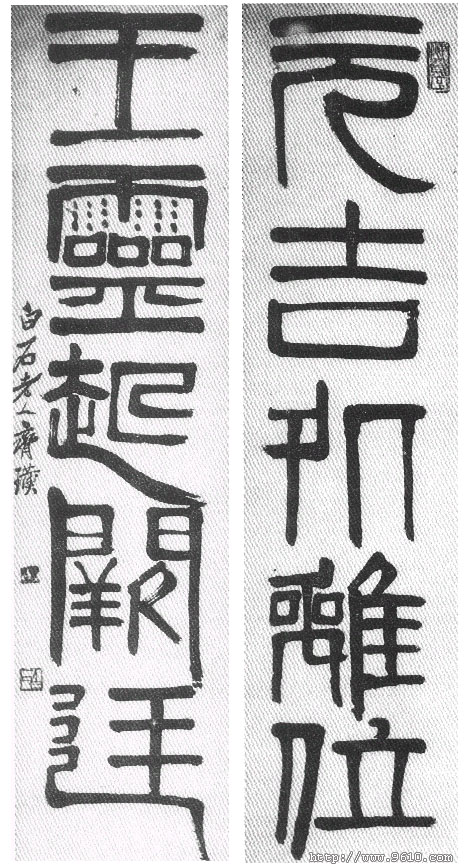 書在寫出了前述《篆書四屏》那件“雜拌兒”風(fēng)格后的七年(一九三一、辛未),齊白石借鑒銅器銘文及詔版書法創(chuàng)作了《漢雙洗室》這件作品,此時(shí),濃郁的齊家樣篆書昧道還不夠,書于前一年(一九三○)冬的《受雨流云聯(lián)》也同樣如此,但筆力的特有的樸拙酣暢已露端倪,結(jié)體也見奇宕之感。老人的篆書代表作品的不妨舉《為毛主席書聯(lián)》及《元吉王靈聯(lián)》為典型。這些作品夸張疏密對(duì)比,收放有致,結(jié)體頗為見出匠心獨(dú)運(yùn)的奇險(xiǎn)與大膽,而用筆卻凝重沉厚,如折釵股、如錐劃沙、如印印泥,具有震撼力和表現(xiàn)力,一種夭矯不凡之意躍然卷楮之上。前者出于丁丑(一九三七)年(庚寅,一九五○年贈(zèng)毛澤東),是他七十四時(shí)的作品,已經(jīng)十分成熟了,完全是白石風(fēng)格。可見至少七十歲前后,老人的篆書已然獨(dú)立面貌了。早期的斑雜不見了,代之以單純化的表現(xiàn),這一追求也正是齊白石審美理想的明確化與獨(dú)立化的關(guān)鍵。老人的“出新”就在于表現(xiàn)上的個(gè)性化的對(duì)于奇崛質(zhì)樸的美感追求。他的獨(dú)立獨(dú)行是建立在扎實(shí)的功夫與敏銳深刻的洞察力之上的。有︽看書︾詩(shī)云:“篆文許慎說(shuō)后止,典故康熙纂后無(wú)。二者不能增一字,老夫長(zhǎng)笑世人愚。”又有“縱橫歪倒貴天真,削作平勻稚子能。若聽長(zhǎng)安流俗論,漢秦金篆盡旁門。”正是有如此識(shí)見氣度,才有了他的實(shí)踐與成就。所以,老人八十五歲以后的篆書作確乎達(dá)于隨心所欲而中矩的境地,直寫一個(gè)大寫的“我”字,卓犖不群,妙化無(wú)端。