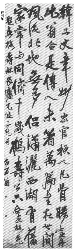 到目前為止,齊白石傳世書法的楷書作品鮮如麟鳳。比較合理的原因,只能解釋是性情使然。因?yàn)辇R白石一生富有叛逆“正統(tǒng)”的思想,他是力主創(chuàng)造和新變的,以至于在詩(shī)稿、題跋上多次用“天真爛漫”、“縱橫歪倒”、“顛倒縱橫”等詞語(yǔ)表述自己的追求。結(jié)合他傳世的大量書、畫、印作品看,也確實(shí)是體現(xiàn)了他的這一思想。因?yàn)榭床坏剿脑缒昕瑫髌妨?而老人在藝術(shù)日趨成熟的六十五歲以后更很少作純粹意義的楷書,我們只能向齊白石的大量行、篆書作品中去找尋消息。也許是為了彌補(bǔ)我們的遺珠之憾,老人至少在九十一歲②時(shí)留下了一幅楷書精品,即《發(fā)揚(yáng)民族文化》這件晚年力作。這件作品,碑意濃郁,氣象雄渾,體勢(shì)中緊外閎,蒼密之氣中饒有稚拙意趣,足有一揮千鈞之勢(shì),令人激賞。從這一遺珠一般的橫披大字楷書中,我們不難發(fā)現(xiàn)齊白石書法其時(shí)所臻至的爐火純青之境界,同時(shí)也可以透視出老人早年扎實(shí)的基礎(chǔ)功力,特別是魏碑根柢以及深厚的筆墨造詣。從有關(guān)資料中知道,齊白石曾“專臨《爨龍顏碑》,后來(lái)又學(xué)《鄭文公碑》,學(xué)得很有功夫的是魏碑”③,以此作證之,確乎言之鑿鑿。追蹤齊白石書法的淵源,可以發(fā)現(xiàn):老人所取法與推崇的前代書家多是品格磊落而個(gè)性很強(qiáng)的人物,他們的書法面貌概屬風(fēng)格強(qiáng)烈、獨(dú)辟町畦的一路。李北海、金冬心、鄭板橋、何紹基、吳昌碩的行楷書如此,便是齊白石取法的篆書范式也是《祀三公山碑》、《天發(fā)神讖碑》等一路奇特的風(fēng)格。從傳世作品估計(jì),齊白石的篆書風(fēng)格形成要晚于他的行書。如他書于六十一歲(一九二四)時(shí)的《篆書四屏》便明顯地流露著雜糝各體的“雜拌兒”式的嘗試意向。款題:“南湖仁弟令以錯(cuò)亂無(wú)度之字書之,不足為教”,應(yīng)該說(shuō)此一偶然性的大膽嘗試,是暗含著一種主體(書家)“欲如此一為”的心理的。這種“以錯(cuò)亂無(wú)度之字書之”的舉動(dòng)雖然出于外因的促成,但事實(shí)上,當(dāng)書家愿意如此去寫并在具體揮運(yùn)時(shí)又是那么認(rèn)真地完成了這件多字?jǐn)?shù)的作品,就已經(jīng)說(shuō)明了問題。齊本人無(wú)疑是甘于這樣“以錯(cuò)亂無(wú)度之字書之”的,這種必然結(jié)果說(shuō)明,齊白石是非常懇切地實(shí)踐著自己的“膽敢獨(dú)造”和“掃除凡格”的審美理想的。這件不很成熟的作品明顯地具備成熟的齊氏篆書的雛形,應(yīng)該承認(rèn),這是老人徘徊摸索階段的產(chǎn)物。但是這件齊白石轉(zhuǎn)捩性變化年代(六十歲左右)的偶然之作,已經(jīng)昭示了齊白石異常強(qiáng)烈的求新求變觀念和正在形成自我風(fēng)格即鄰近藝術(shù)質(zhì)變期的創(chuàng)作心態(tài)那是與鄭板橋的“六分半書”與“亂石鋪街體”相一致的精神向往。結(jié)合老人深得板橋神韻的《書李白詞》來(lái)看,我們清楚地知道,齊白石書法無(wú)論行書還是篆書都是非常地深入過傳統(tǒng)之后而金蟬脫殼的。人合,后與古人離”的實(shí)踐在齊白石的書法上得到了良好的成功。許多 藝術(shù)大師都是沿著這樣一條通衢大道拓展出自我的藝術(shù)天地的。張大千以創(chuàng)作的仿制古畫驚服藝壇是盡人皆知的,為此美國(guó)一收藏家、史論家還為他舉辦了“血戰(zhàn)古人”的專題展。只是,齊白石的轉(zhuǎn)換能力很是厲害,他“血戰(zhàn)古人”之后是“絕無(wú)人處且遲歸”(齊詩(shī)句),他要領(lǐng)引一代審美風(fēng)騷!