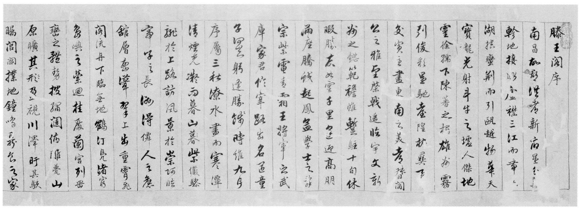 釋文:南昌故郡,洪都新府。星分翼軫,地接衡廬。襟三江而帶五湖,控蠻荊而引甌越。物華天寶,龍光射牛斗之墟;人杰地靈,徐孺下陳蕃之榻。雄州霧列,俊采星馳。臺隍枕夷夏之交,賓主盡東南之美。都督閻公之雅望,棨戟遙臨;宇文新州之懿范,襜帷暫駐。十旬休假,勝友如云;千里逢迎,高朋滿座。騰蛟起鳳,孟學(xué)士之詞宗;紫電青霜,王將軍之武庫。家君作宰,路出名區(qū);童子何知,躬逢勝餞。