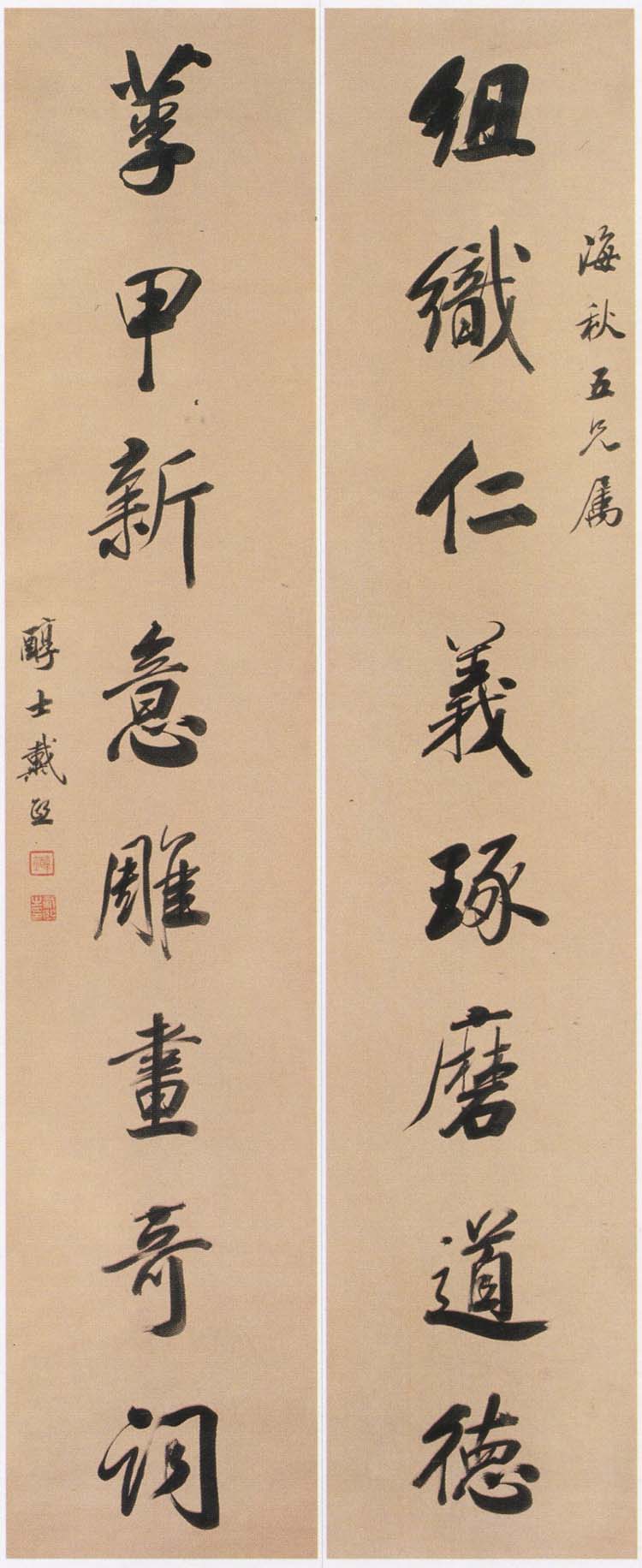 戴熙《行書組織莩甲八言聯(lián)》 珊瑚箋行書 165×31cm×2 常州博物館藏 釋文:組織仁義,琢磨道德;莩甲新意,雕畫奇詞。 款署:海秋五兄屬,醇士戴熙。 鈐印:醇士(朱文)、戴熙之印(白文)