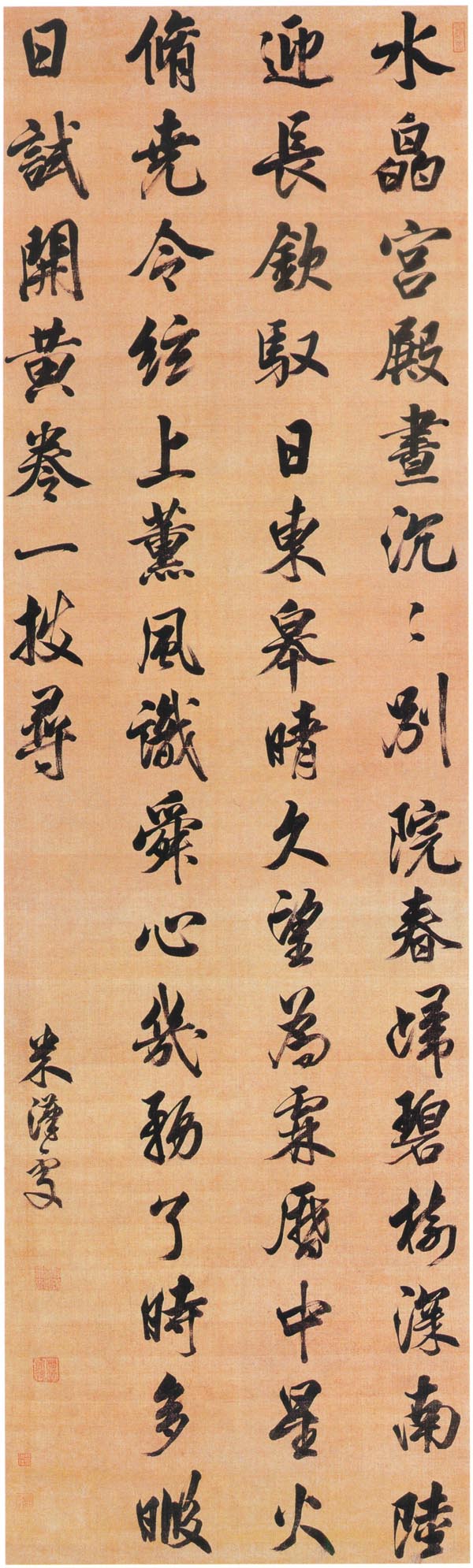 清 米漢雯《行書七律詩軸》絹本行書 216×63.8cm 天津博物館藏 釋文:水晶宮殿晝沉沉,別院春歸碧樹深。南陸迎長欽馭日,東皋晴久望為霖。歷中星火修堯令,弦上薰風(fēng)識舜心。幾務(wù)了時多暇日,試開黃卷一披尋。 款署:米漢雯。