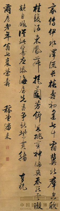 釋 文:家傳伊水澤流長,椿壽初逢七十霜。冀北群空欣桂馥,河?xùn)|鳳舞挹蘭芳。餌成桃實(shí)神偏爽,奏罷云璈韻自揚(yáng)。從此籌應(yīng)添海屋,先看爭獻(xiàn)紫霞觴。 奉祝耳房老年翁七帙榮壽。稼堂潘耒。 小莽蒼蒼齋舊藏 田家英家屬 捐贈(zèng) 【資料來源】中國國家博物館網(wǎng)站