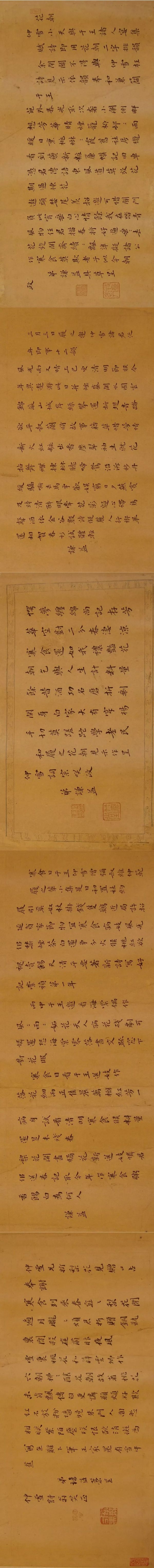 錢謙益的書法真跡極少,常熟博物館收藏有錢謙益楷書《與仲雪等唱和詩》卷、錢謙益行書王維詩扇頁等。《與仲雪等唱和詩》縱22.2厘米、橫212厘米,此卷為崇禎元年(1628)錢謙益手書與好友徐于王、魏浣初(仲雪)、錢謙貞(履之)、邵僧彌、張叔維等唱和詩作,共五段,前四段楷書,第五段行書,詩文內(nèi)容與《初學(xué)集》所錄略有差異。是歲牧齋年四十七,其書法穩(wěn)重靜穆,不激不厲,自有一股書卷之氣。因錢謙益歿后在乾隆年間被朝廷列為“貳臣”,其書籍及墨跡遭禁毀,故此詩卷彌足珍貴。
