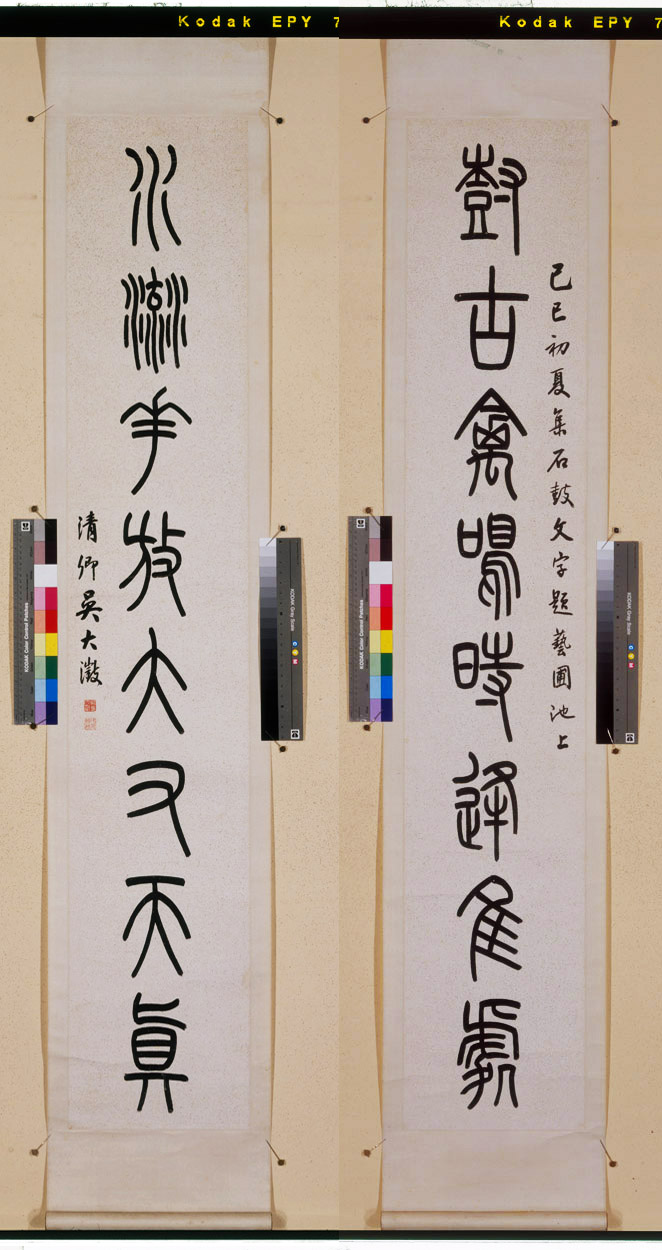 釋文:樹古禽鳴時逢佳處,水流花放大有天真。己巳初夏集石鼓文字題藝圃池上。清卿吳大澂。