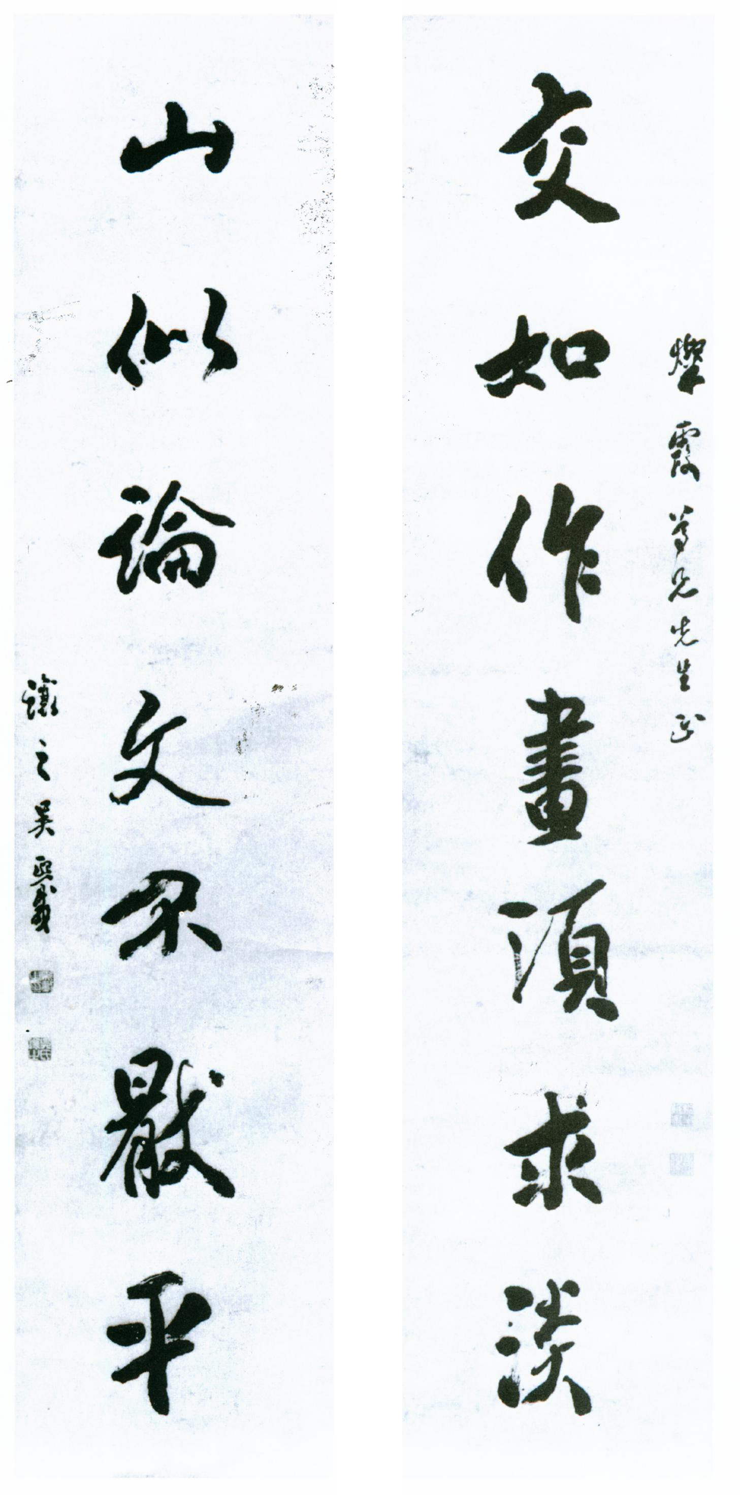 《贈(zèng)燦霞行書七言聯(lián)》 紙本,134×31cm 日本青山杉雨舊藏 釋文: 交如作畫須求淡,山似論文不厭平。燦霞尊兄先生正,讓之吳熙載。 轉(zhuǎn)自《中國(guó)書法全集》清代名家卷三