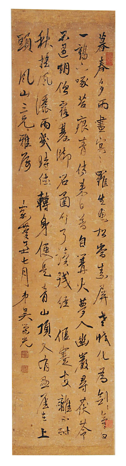 這件作品作于嘉慶二十二年的七月,此時(shí)吳榮光正值中年,在京充任軍機(jī)章京,仕途順利,意氣風(fēng)發(fā),其書(shū)亦氣勢(shì)凌厲,鋒芒外露,但缺乏雄渾凝重的氣概。此作多取法董其昌,運(yùn)筆流暢,但不及董書(shū)的從容舒展、清新淡雅。