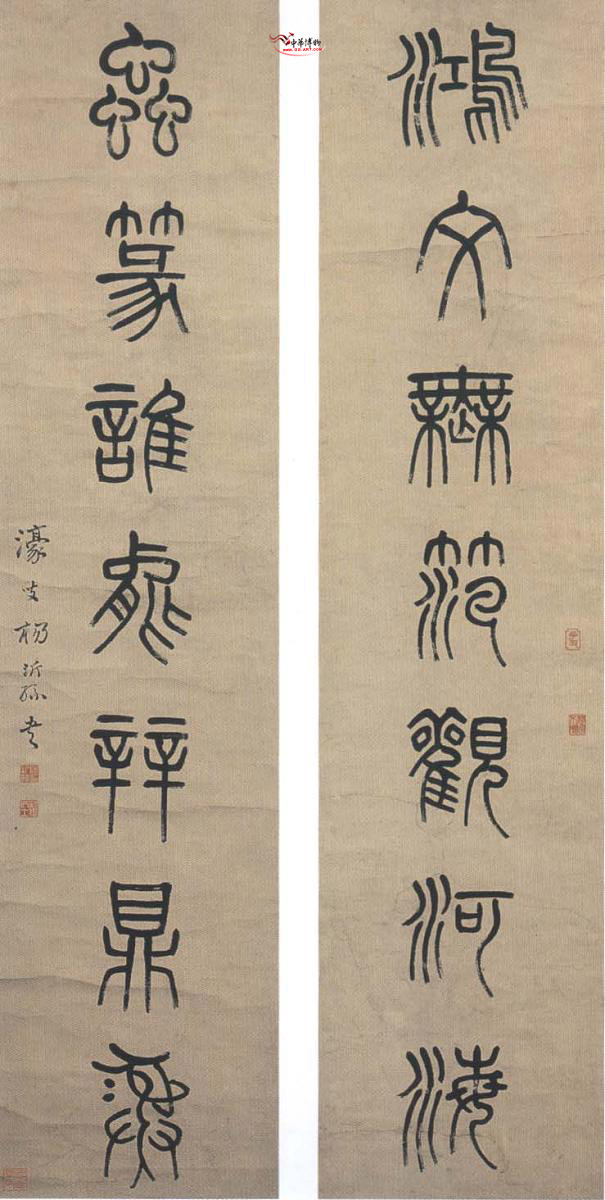 楊沂孫《篆書鴻文蟲篆七言聯(lián)》紙本篆書 132×32cm×2