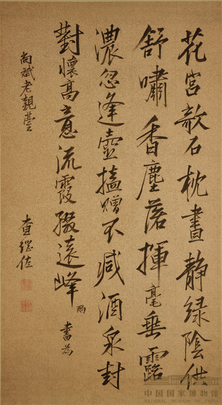 釋 文:花宮欹石枕,書靜綠陰供。舒嘯香塵落,揮毫垂露濃。忽逢壺?fù)t贈(zèng),不減酒泉封。對(duì)酌懷高意,流霞綴遠(yuǎn)峰。 書為尚斌老親臺(tái)。查繼佐。