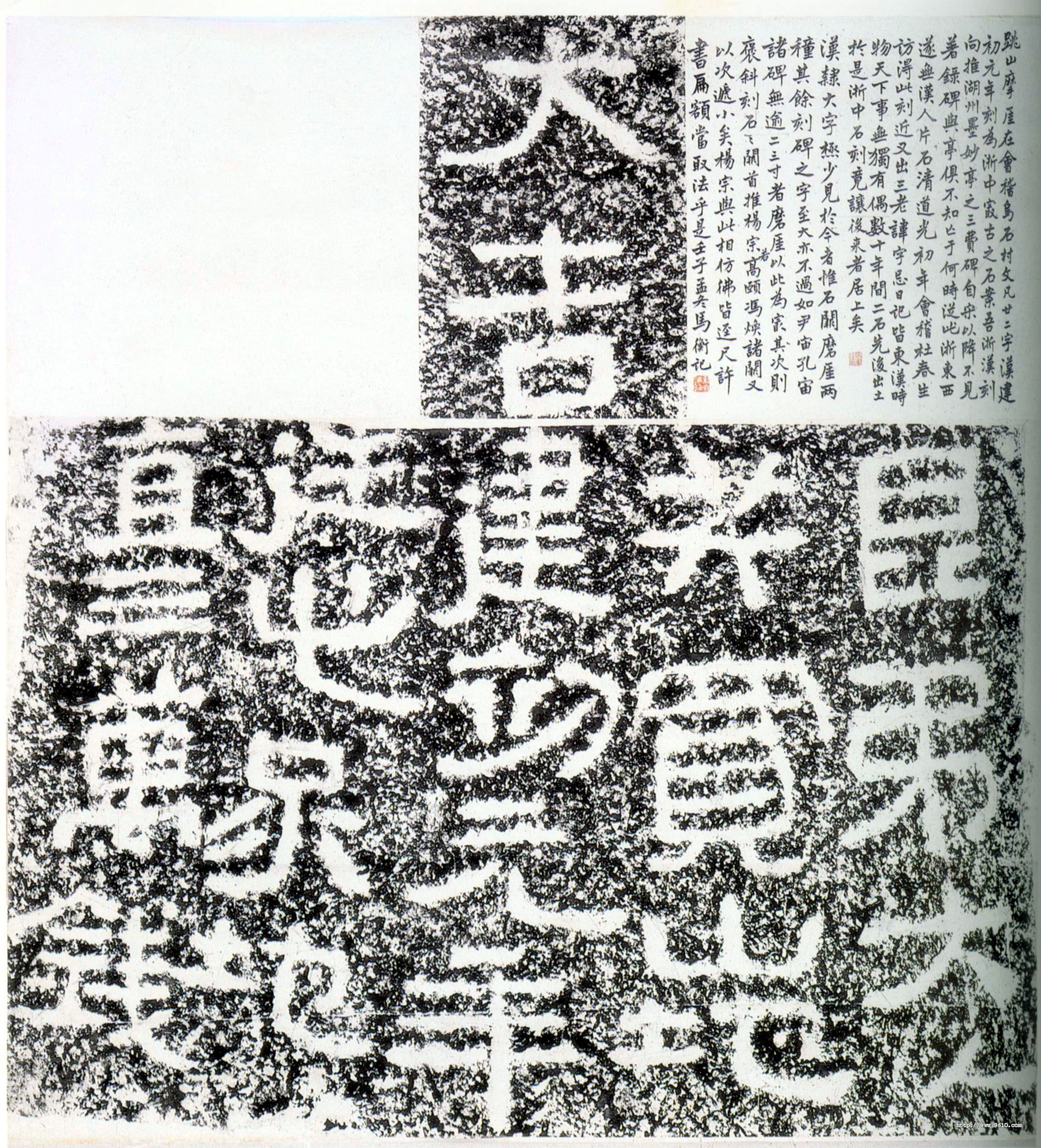 此拓本為清拓,右上角有馬衡壬子(1912年)孟冬二跋。跋稱此石系“道光初年會(huì)稽杜春生訪得,與《三老諱字忌日記》皆東漢時(shí)物”,為“浙中最古之石”。又云:“漢隸大字極少,見于今者惟石闕、摩崖兩種。其余刻碑之字至大亦不過如《尹宙》、《孔宙》諸碑,無逾二三寸者。摩崖以此為最,其次則《褒斜刻石》;石闕首推楊宗,若高頤、馮煥諸闕,又以次遞小矣。楊宗與此相仿佛,皆徑尺許,書扁額當(dāng)取法乎是。” 此本拓墨厚重,字口清晰準(zhǔn)確,又有馬衡先生親筆考證、評(píng)騭,是為可珍。