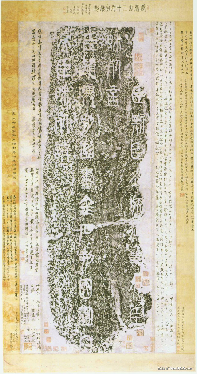 此刻石原分為兩部分:前半部系公元前219年秦始皇東巡泰山時(shí)所刻,共144字;后半部為秦二世胡亥即位第一年(公元前209年)刻制,共78字。刻石四面廣狹不等, 刻字22行,每行12字,共222字。兩刻辭均為李斯所書。現(xiàn)僅存秦二世詔書10個(gè)殘 字,即“斯臣去疾昧死臣請(qǐng)矣臣”,又稱“泰山十字”。據(jù)清道光八年(1828年)《 泰安縣志》載,宋政和四年(1114年)刻石在岱頂玉女池上,可認(rèn)讀的有146字,漫滅剝蝕了76字。明嘉 靖年間,北京許某將此石移置碧霞元君宮東廡,當(dāng)時(shí)僅存二世詔書4行29字,即“臣斯臣去疾御史夫臣昧死言臣請(qǐng)具刻詔書金石刻因明白矣臣昧死請(qǐng)”。清乾隆五年(1740年)碧霞祠毀于火,刻石遂失。