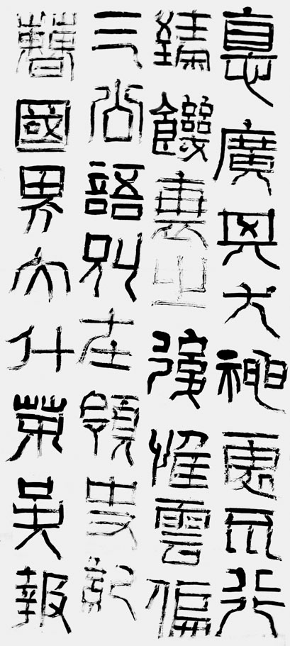 《祀三公山碑》行間茂密,大小穿插,長(zhǎng)短變化,由于行距相等而字距不等,因此具有變化中的整齊美。在單字的結(jié)構(gòu)上它也不同一般,部首的組合,常常超越了常規(guī),出人意料地夸大某一個(gè)局部,使許多字展現(xiàn)出一種拙笨的動(dòng)態(tài),形成了獨(dú)特的風(fēng)采。