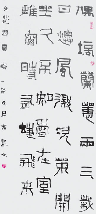 在漢代的篆書(shū)中風(fēng)格與它比較接近的還有《漢嵩山少室神道闕》,《王莽新嘉量》、《嵩山開(kāi)母廟石闕》,以及碑的篆額,漢瓦當(dāng)文,漢磚文等。這里刊出的《漢單于和親方磚》結(jié)體古樸,也屬漢篆中的佳作,這種平正方直的漢篆在漢又稱(chēng)繆篆,漢印中的文字亦包括在繆篆之中,因此《漢祀三公山碑》自出土以來(lái),和其他漢代篆書(shū)的資料一起一直被篆刻家視為學(xué)習(xí)的典范。