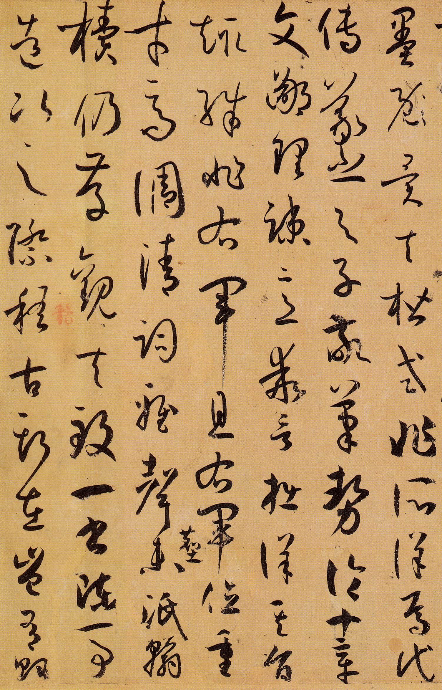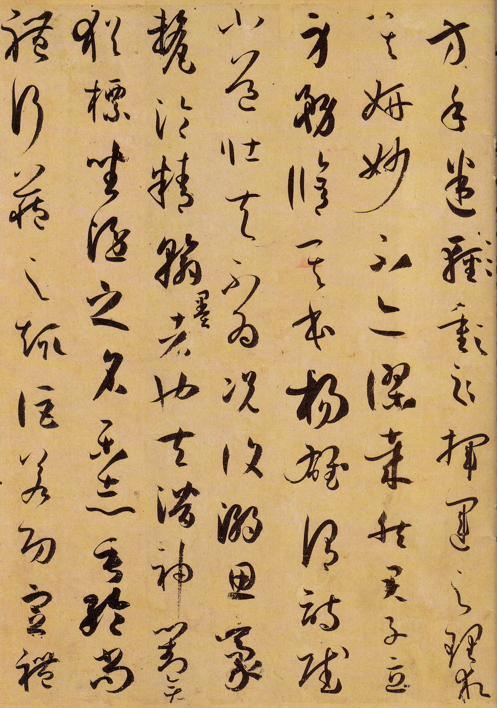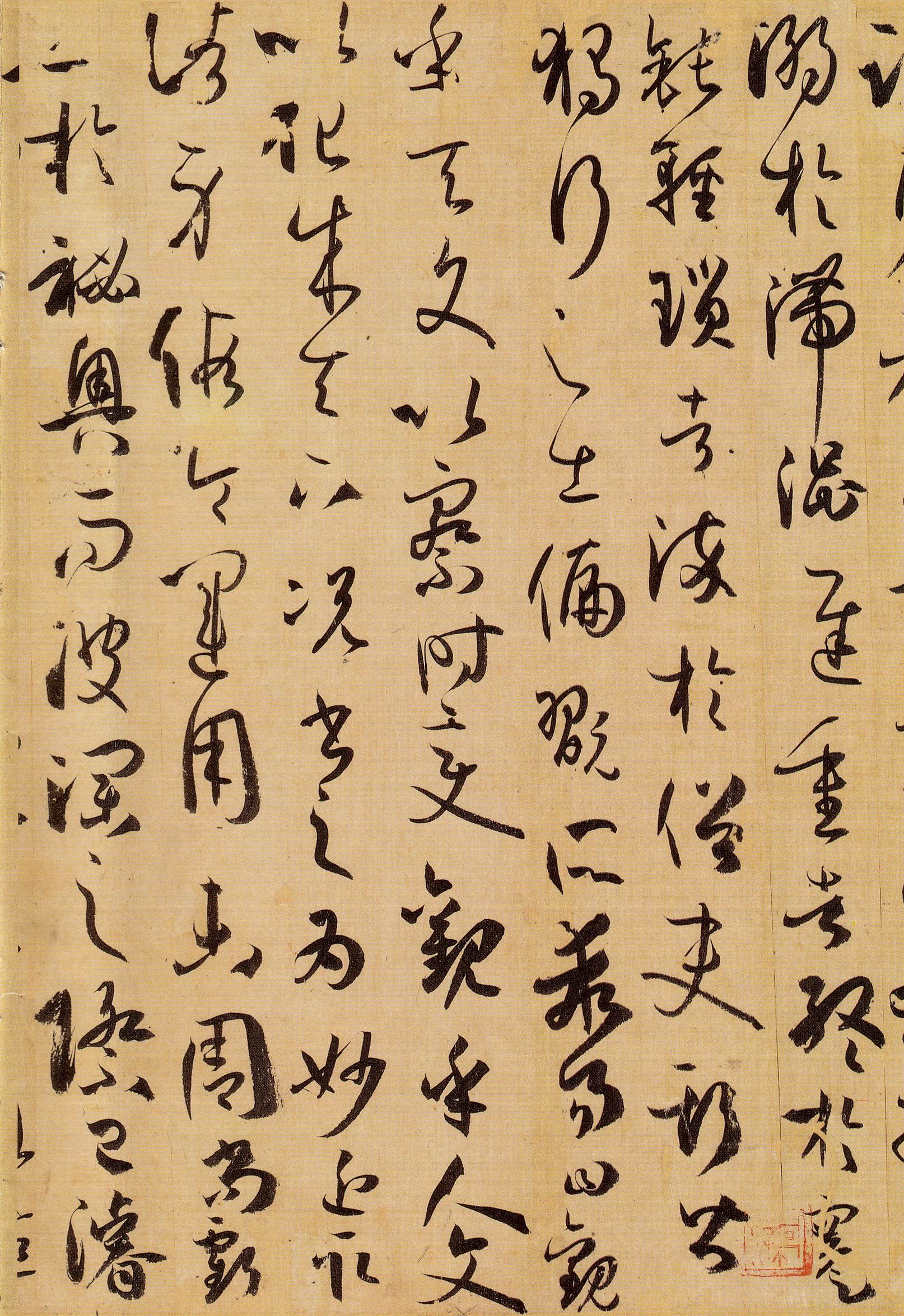 孫過庭專習(xí)王羲之草書,筆法精熟,唐代無人能與他相比。本卷紙墨精好,神彩煥發(fā),不僅是一篇文辭優(yōu)美的書學(xué)理論,也是草書藝術(shù)的理想典范。卷中融合質(zhì)樸與妍美書風(fēng),運筆中鋒側(cè)鋒并用,筆鋒或藏或露,忽起忽倒,隨時都在變化,令人目不暇給。筆勢縱橫灑脫,達到心手相忘之境。(撰稿、何傳馨)