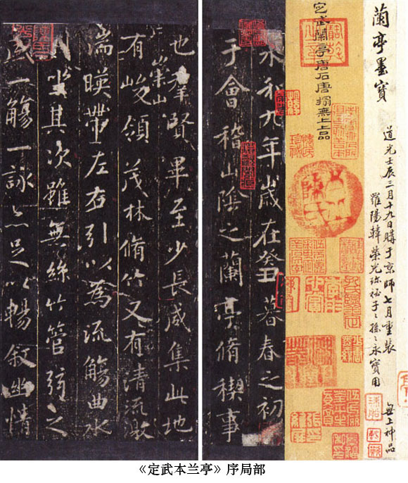 東晉繼續(xù)禁碑,正式碑刻極少,著名的《爨寶子碑》,出于云南邊地,處于似楷似隸之間,是少數(shù)民族的一件杰作;在東晉統(tǒng)治的核心地區(qū),目前所見主要是王謝墓志,材質(zhì)多為磚,或許不是非常正式的,如《王興之夫婦墓志》、《謝鯤墓志》、《顏謙婦劉氏墓志》、《王閩之墓志》、《夏金虎墓志》、《謝琰及妻王氏墓志》等。這些作品與世家大族書法有很大的不同,方整樸拙,橫劃尾部還往往有向上挑的意圖,保持了較濃厚的隸書特點(diǎn)。王謝墓志的出土及它們的這些特點(diǎn),引起了研究者的關(guān)注。從清代起就已經(jīng)產(chǎn)生的關(guān)于《蘭亭》的真實(shí)性的懷疑,再次被提出,從而在本世紀(jì)中期掀起了一場聲勢浩大的“《蘭亭》論辯”,至今仍然沒有得出一致的意見。