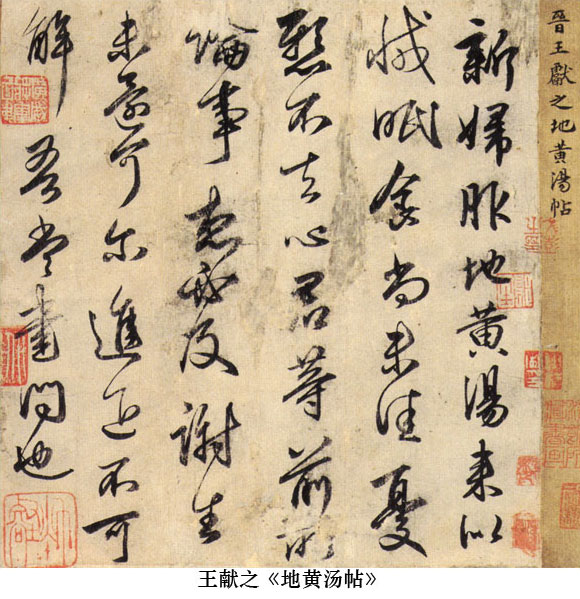 (4)郗氏家族后起,也出現(xiàn)了幾位有影響的人物,如郗愔、郗曇,王羲之早年書法不及郗愔(虞龢《論書表》)。郗家書法,以郗愔為最。他的思想以道為主,致力于玄學(xué)、書法、優(yōu)游。善于章草,代表作《至慶帖》。