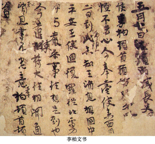 墨跡則主要是十六國地區(qū)作品,有:前涼《李柏文書》、前秦《譬喻經(jīng)》、西涼《十誦比丘戒本經(jīng)》、北涼《沮渠封戴贈(zèng)官木表》、后梁《維摩經(jīng)卷》、西涼《秀才對策文》和《妙法蓮花經(jīng)》等。《李柏文書》最為引人注目,它同王羲之早年的《姨母帖》有許多相似之處,保存了行、楷的發(fā)展軌跡,對于考察文字的演變和書風(fēng)的變化都有極高的參考價(jià)值。其他幾件作品,多介于隸、楷之間,也是文字演變的重要資料,同時(shí)由于隸、楷的結(jié)合極有特點(diǎn),在書法領(lǐng)域里也是別具特色的作品。
