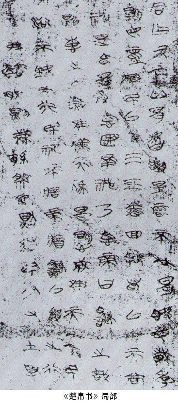 楚帛書的文字具有典型的楚地地方特色,起收筆鋒運用的變化不大,筆劃呈弧形而且傾斜,富有動感;字形多取扁勢、側(cè)勢,有一種自然隨意的效果。